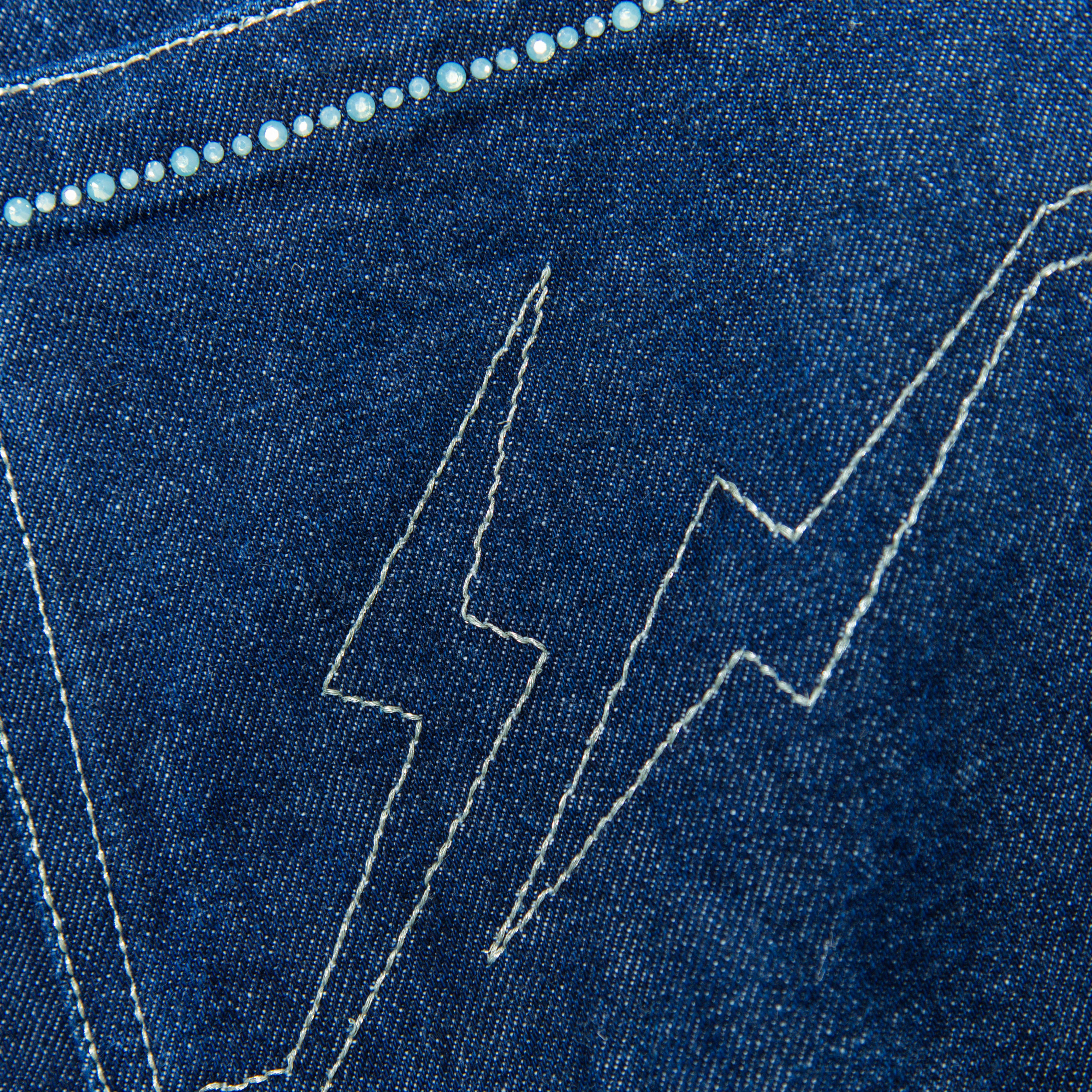A standout from the coveted Disco line, the 2007 Levi’s Fenom 207 denim was a collaboration between Levi’s Japan and Hiroshi Fujiwara’s Fragment Design. Released in Blue, Teal, Red, and Silver variants, each pair features Swarovski crystals embedded along the back pockets and down the side seams, paired with Fragment’s signature lightning bolt embroidery. Designed with a slim, straight-leg fit and subtle custom paint details, the Disco series fused punk minimalism with early-2000s streetwear luxury.