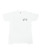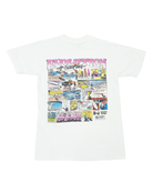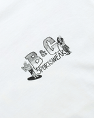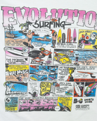 1990s B&G Sports Wear Evolution of Surfing Comic tee in white features playful graphic storytelling of surfing’s history, a unique piece blending humor with classic 90s surfwear design.
