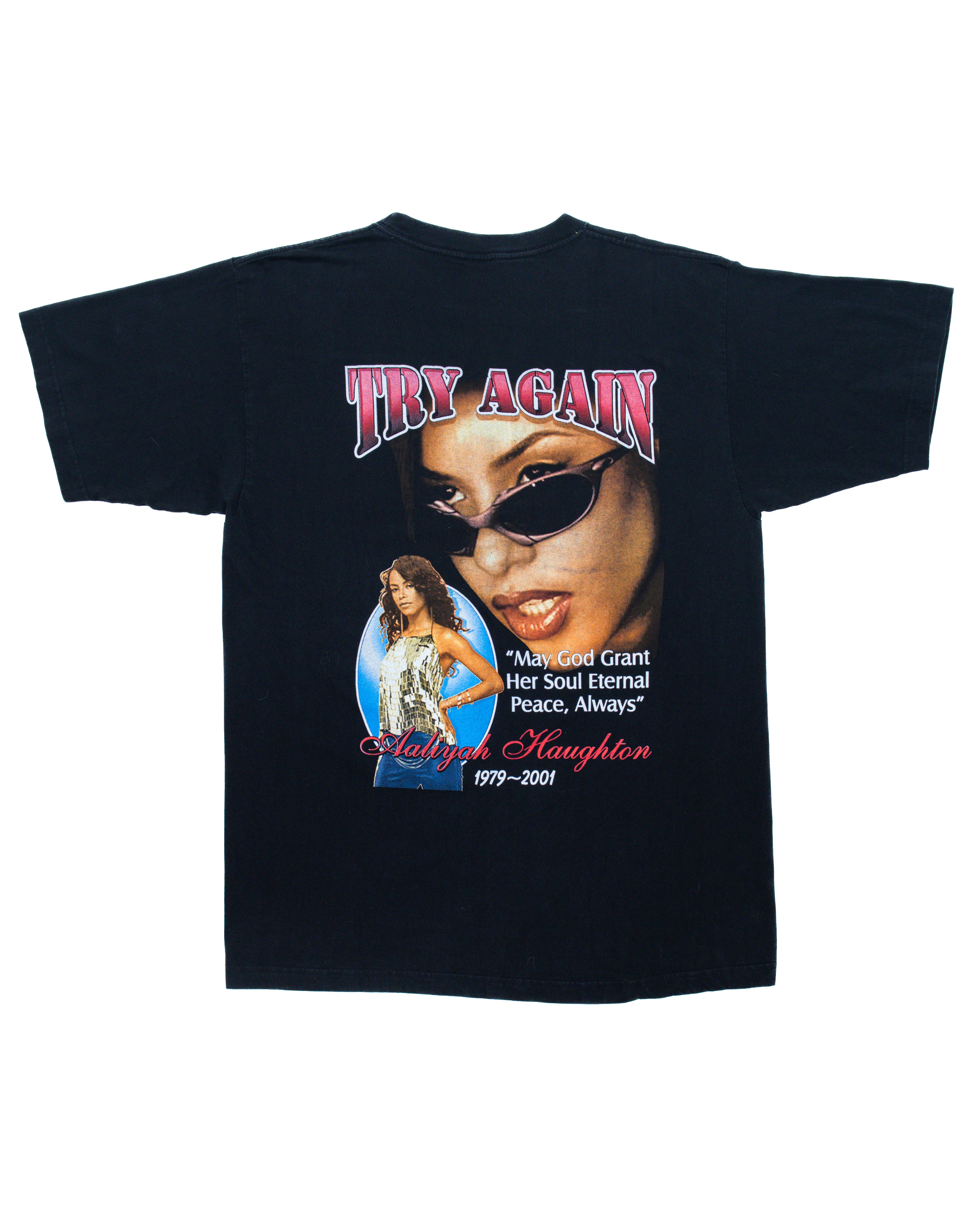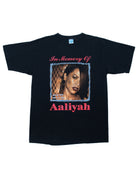 A heartfelt tribute tee remembering R&B icon Aaliyah, whose life was tragically cut short in 2001. Known for hits like “One in a Million,” “Try Again,” and “Are You That Somebody,” Aaliyah was both a musical innovator and a style blueprint. These memorial tees—often bootlegged and sold at parking lots and corners—became sacred relics of a lost talent who defined a generation’s aesthetic.