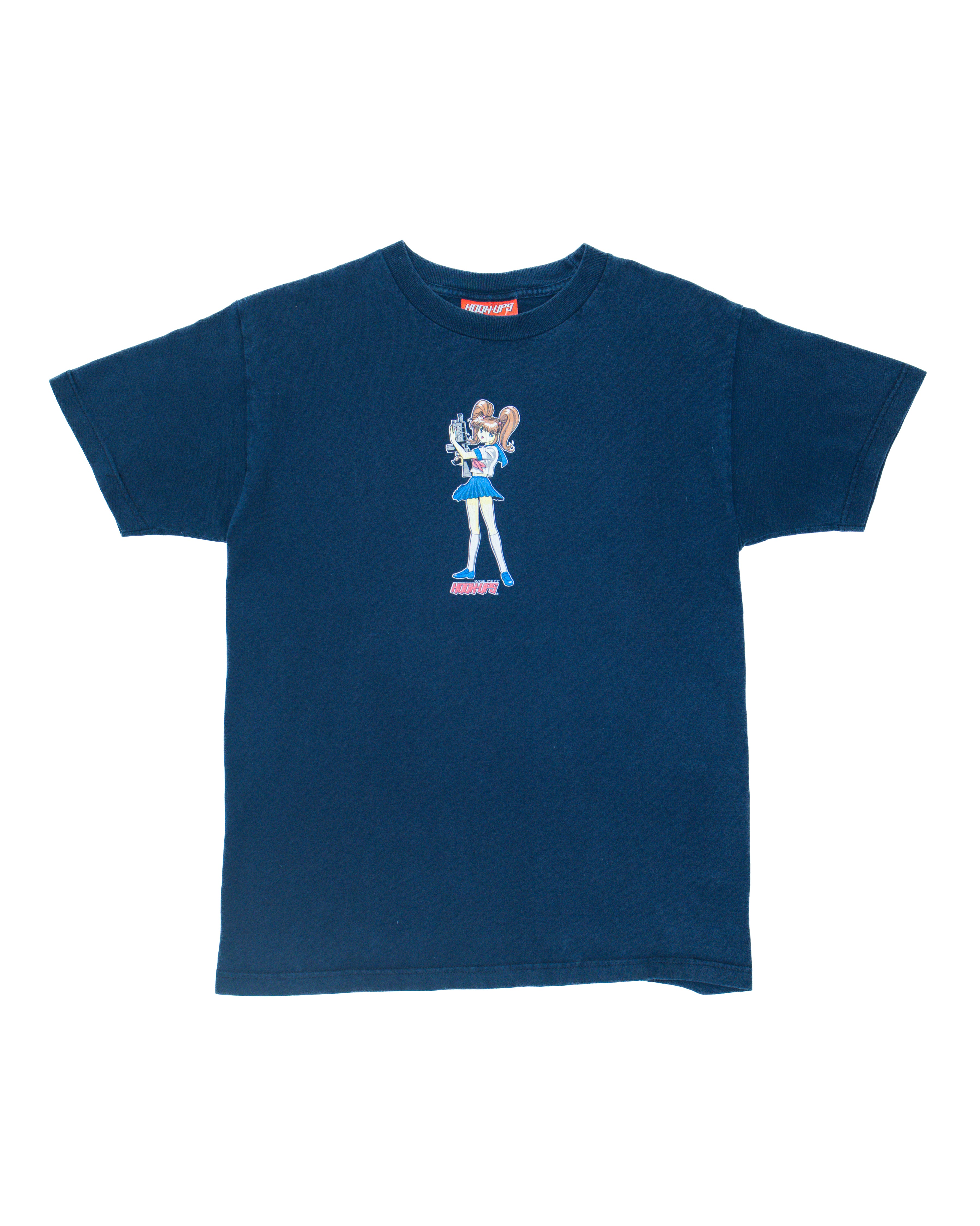 The 1990s Hook-Ups “Machine Gun Girl” tee captures the provocative anime-meets-skate aesthetic that defined the brand’s cult following. Created by Jeremy Klein, Hook-Ups pushed boundaries with bold, manga-inspired graphics that became emblematic of 90s skate counterculture. A highly collectible design that embodies the raw edge and visual chaos of the scene.