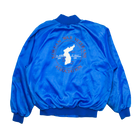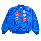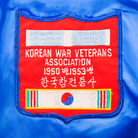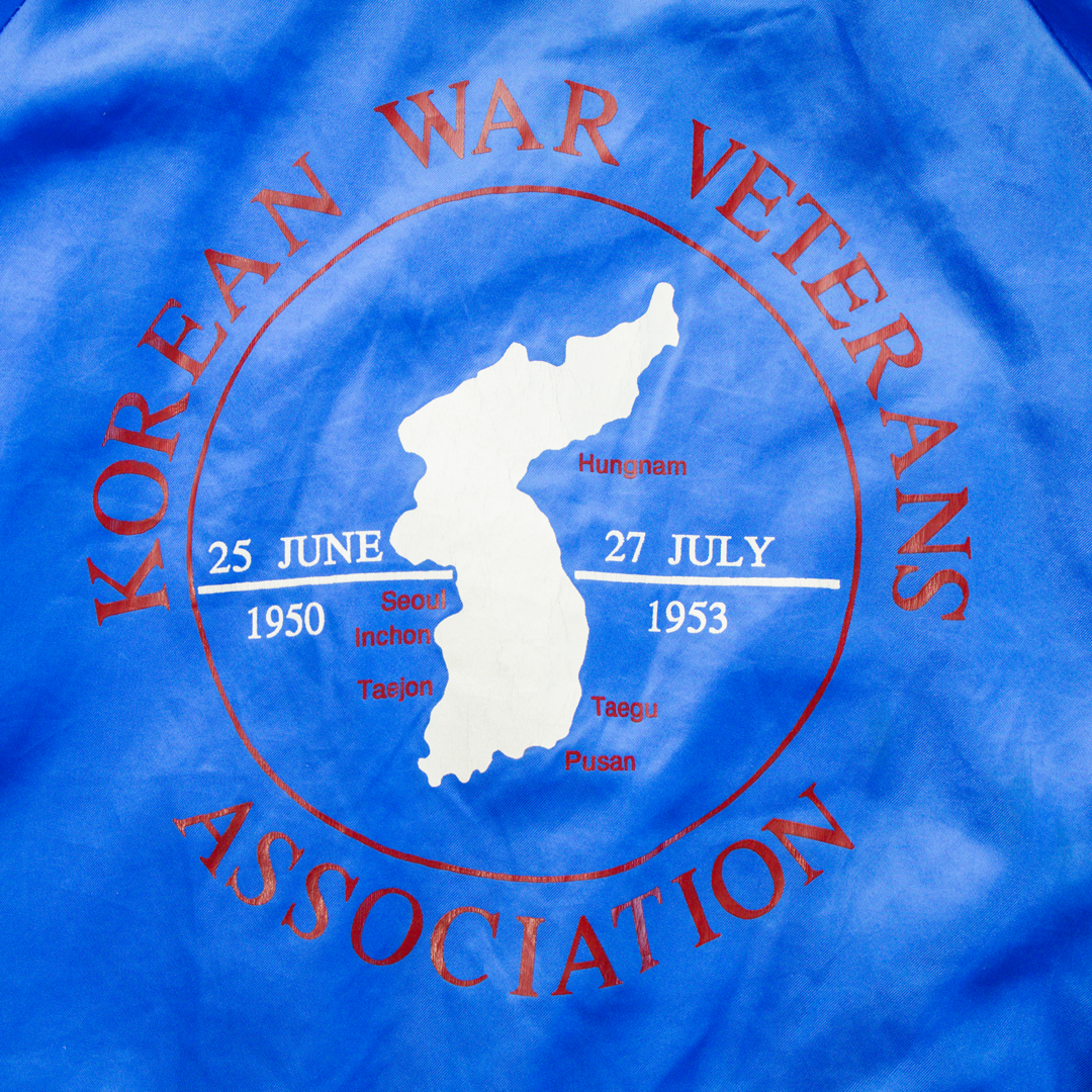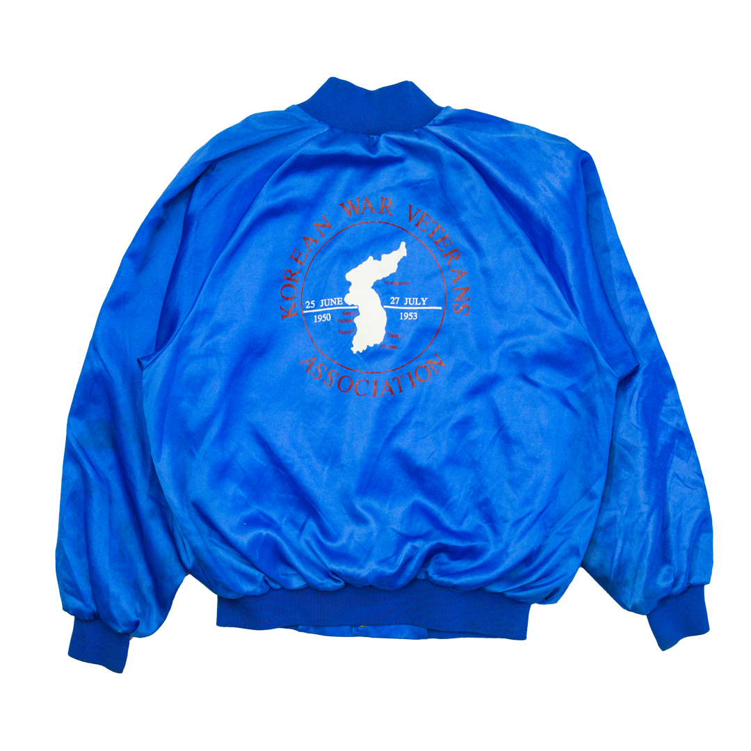 This vintage nylon button-up jacket, likely dating back to the 1970s or 1980s (or possibly even earlier), is a unique relic with deep historical significance. In a striking royal blue, it features natural discoloration throughout, adding to its authentic aged look. The back showcases a graphic of a basic map of Korea, reminiscent of designs from the Korean War era, while the front is adorned with a series of patches, including a United Nations patch and another specifically for the Korean War. This piece not only embodies the aesthetics of vintage military jackets but also serves as a wearable tribute to history, making it a captivating find for collectors and history enthusiasts alike.