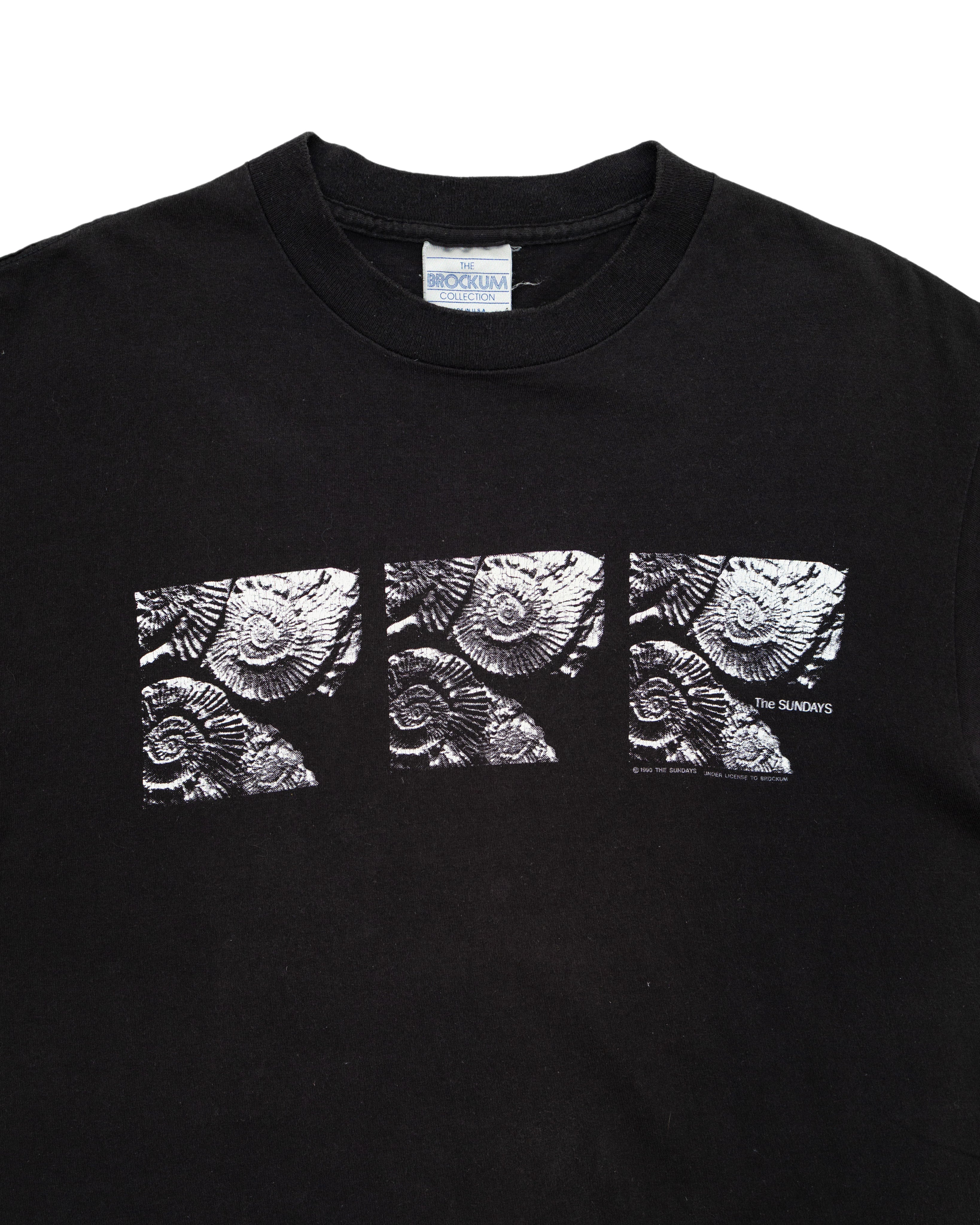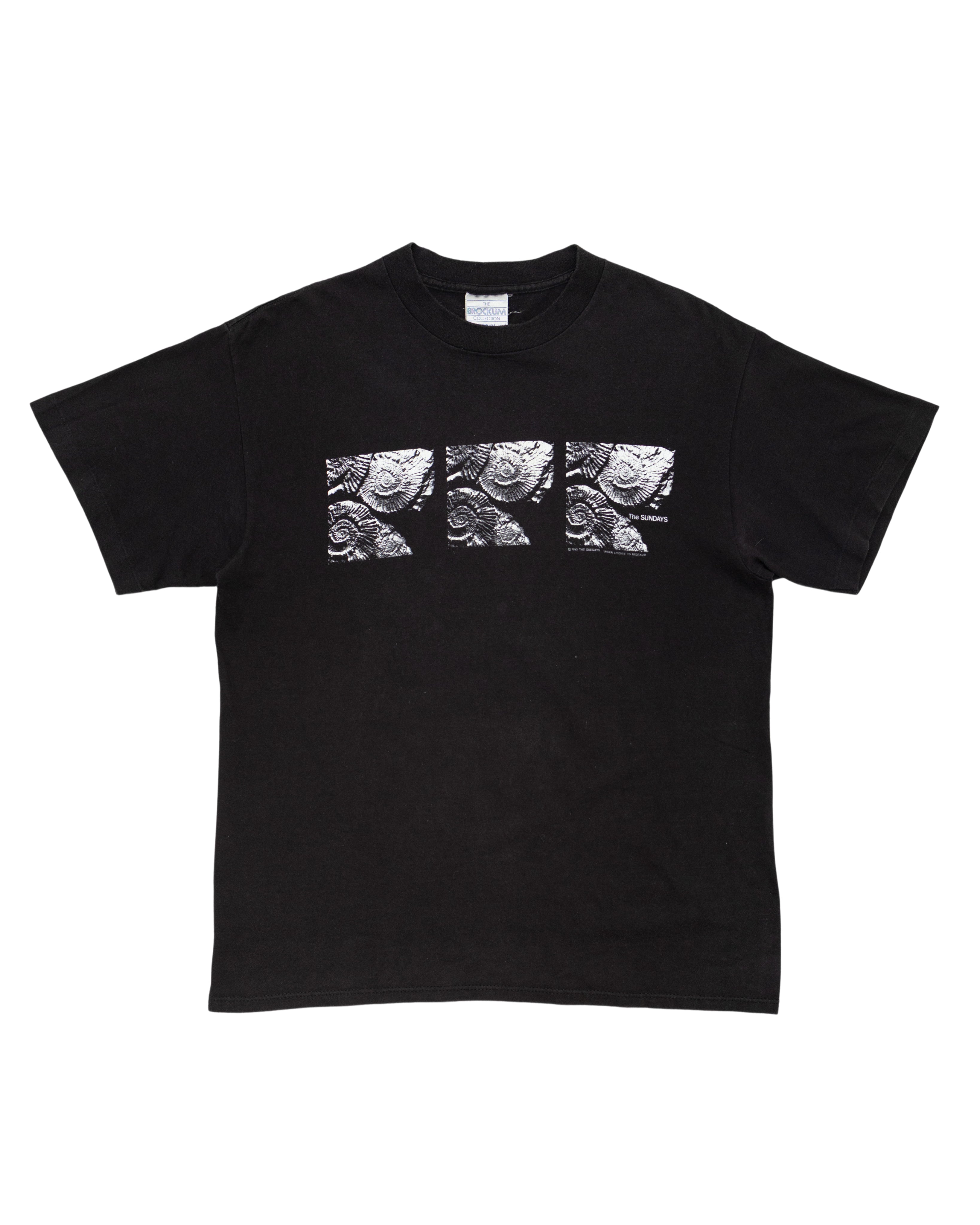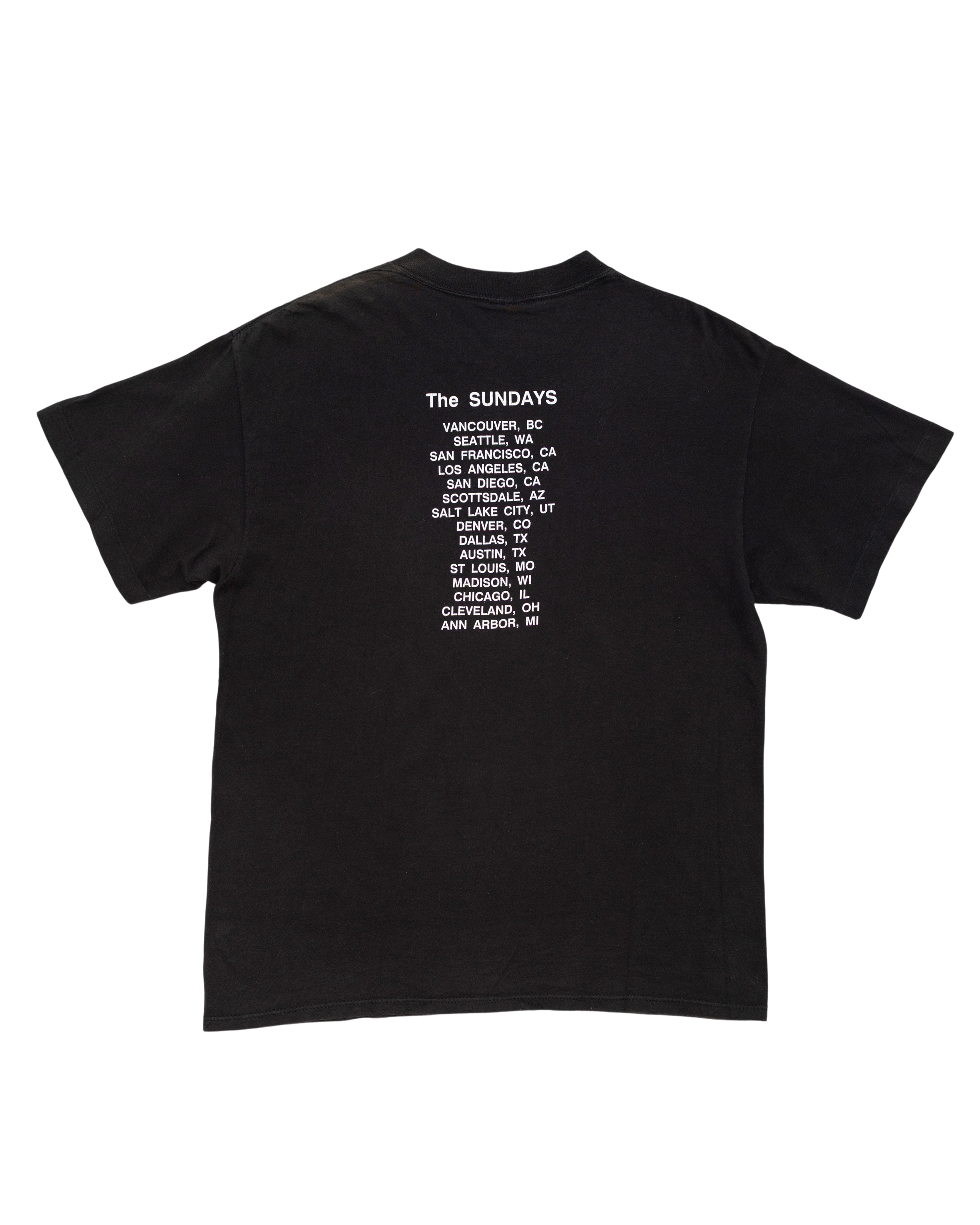 The black Sundays tee features a repeating graphic of their landmark debut *Reading, Writing & Arithmetic* across the chest. A poetic and minimal shirt fitting the band’s delicate dream pop tone.