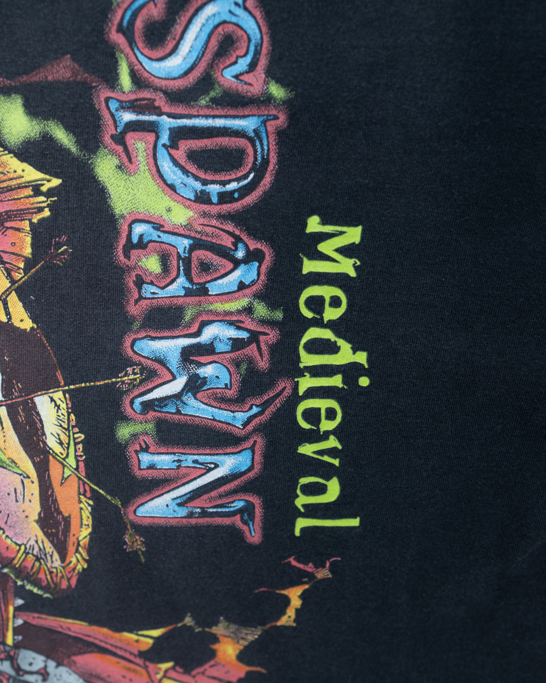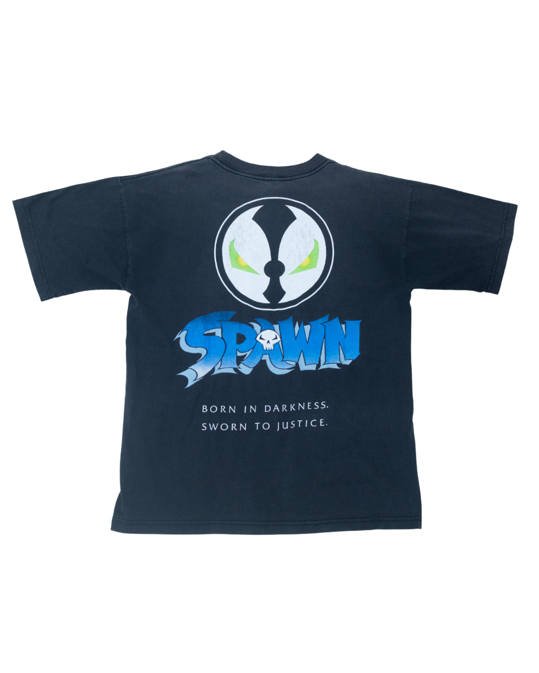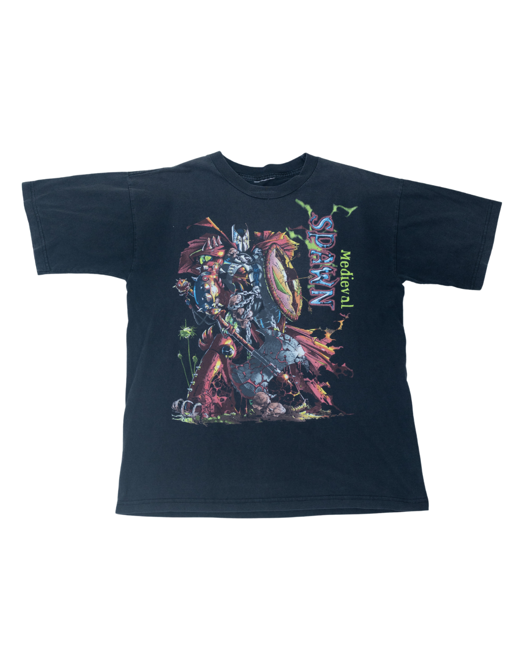 Spawn’s dark medieval imagery defined 1990s comic culture, with Todd McFarlane’s antihero becoming a cult favorite. Original Spawn tees like this one are prized among comic and animation fans for their bold, gritty designs.