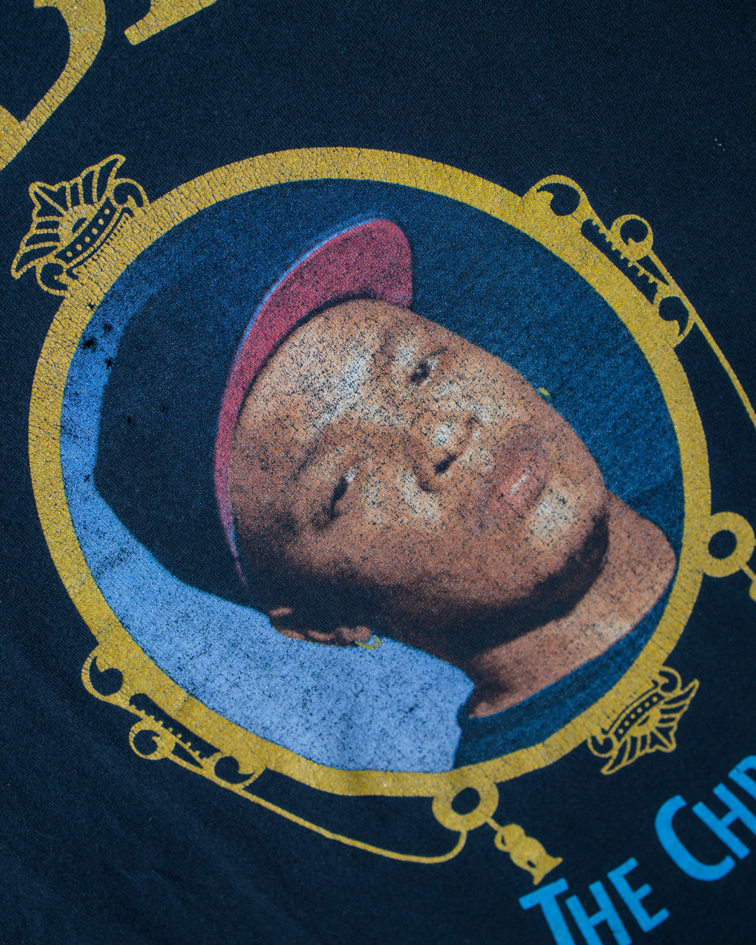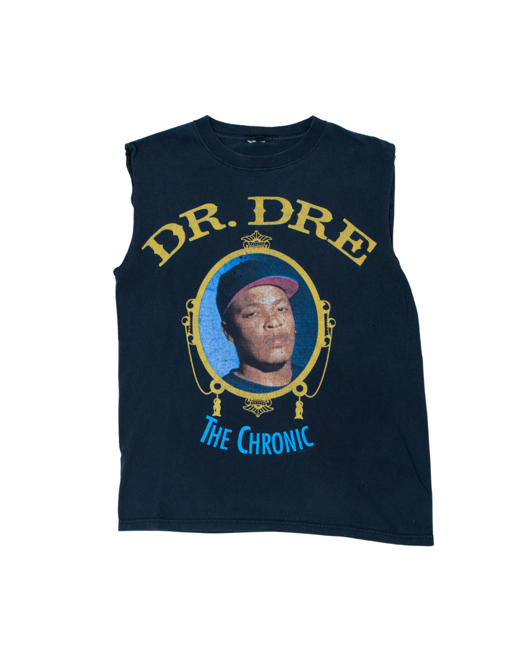 This 2005 Dr. Dre tee pays homage to one of hip-hop's most influential albums, The Chronic, and his tenure at Death Row Records. By this time Dre was already a living legend, shaping the sound of West Coast rap and launching careers of icons like Snoop Dogg and Tupac. The cutoff style gives it a street-worn look that mirrors the raw edge of the music itself.
