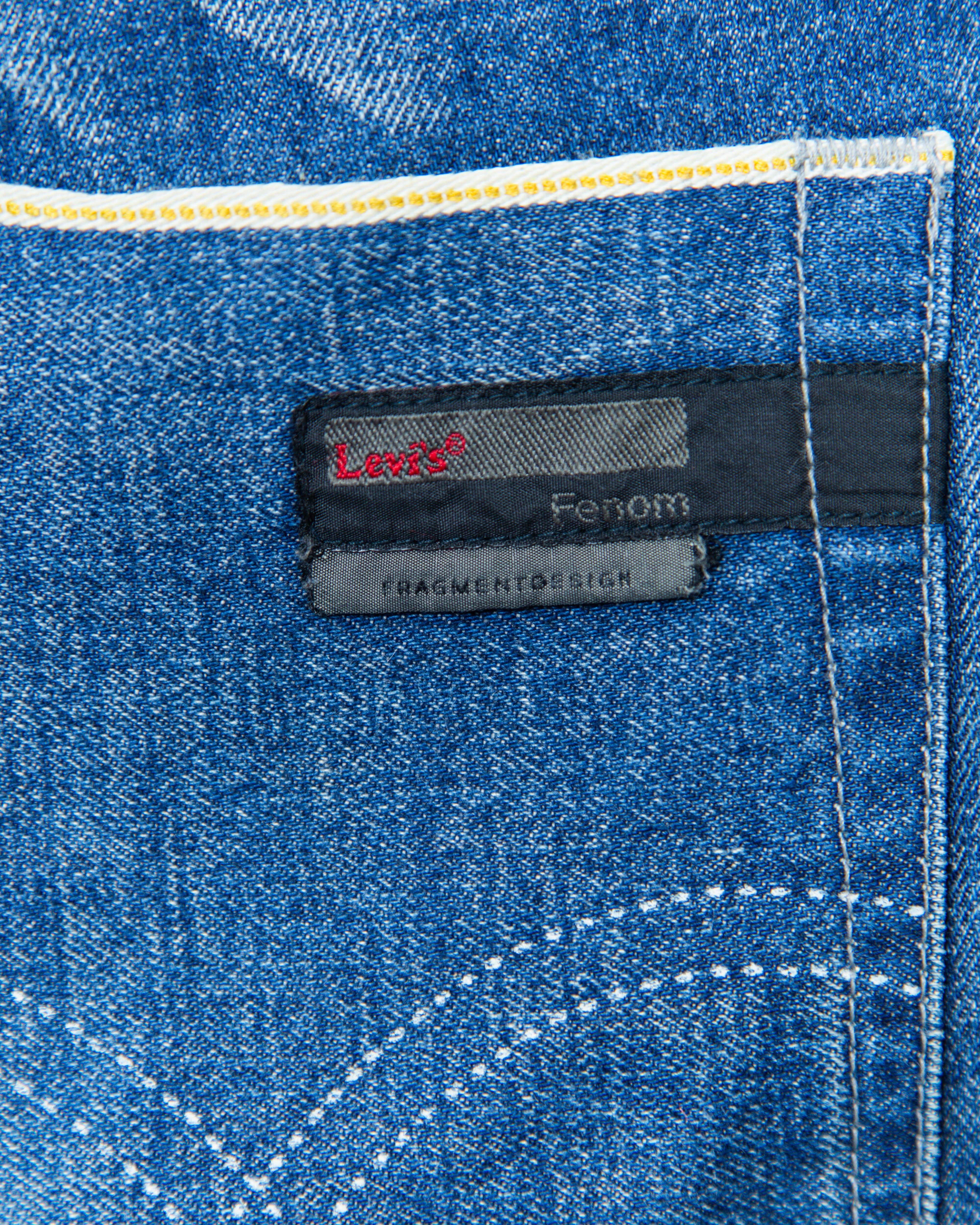 2007 Levi’s Fenom 207M denim in medium wash with white stitching. A light tonal update from the Fragment line, blending classic Americana structure with Tokyo-leaning customization.