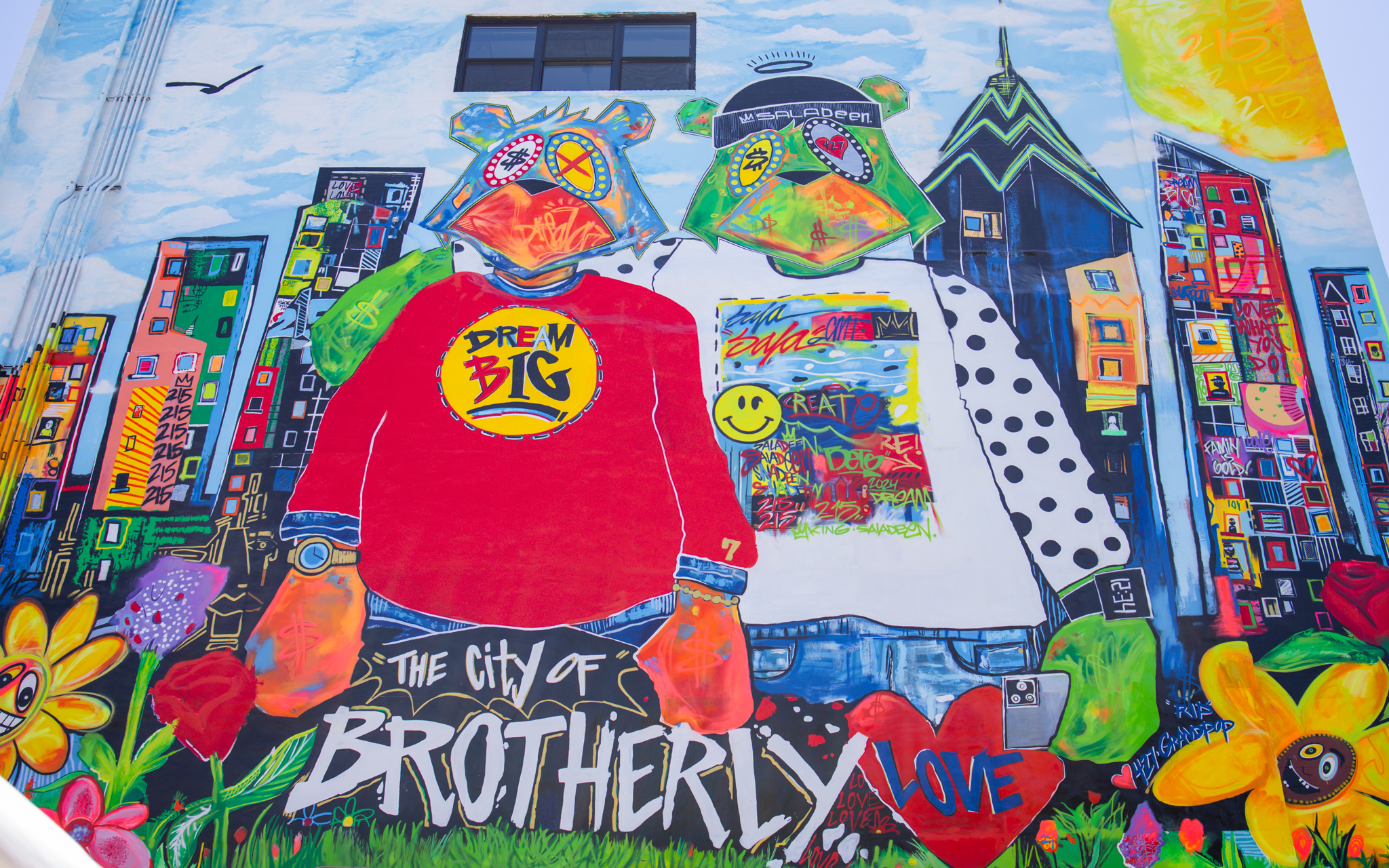Philadelphia street artist King Saladeen unveiled his first hometown mural in the neighborhood of West Philadelphia on June 8th. The mural was commissioned by Mural Arts Philadelphia and used local artists and workers from the community to bring it to life. The mural features Saladeen and his late friend JP – the person who most inspired him to become a full-time artist – with the Philadelphia skyline in the background, on what Saladeen calls the best day of his life. Saladeen regularly honors JP in his work through his famous “JP The Money Bear” logo, which features in this mural as well.