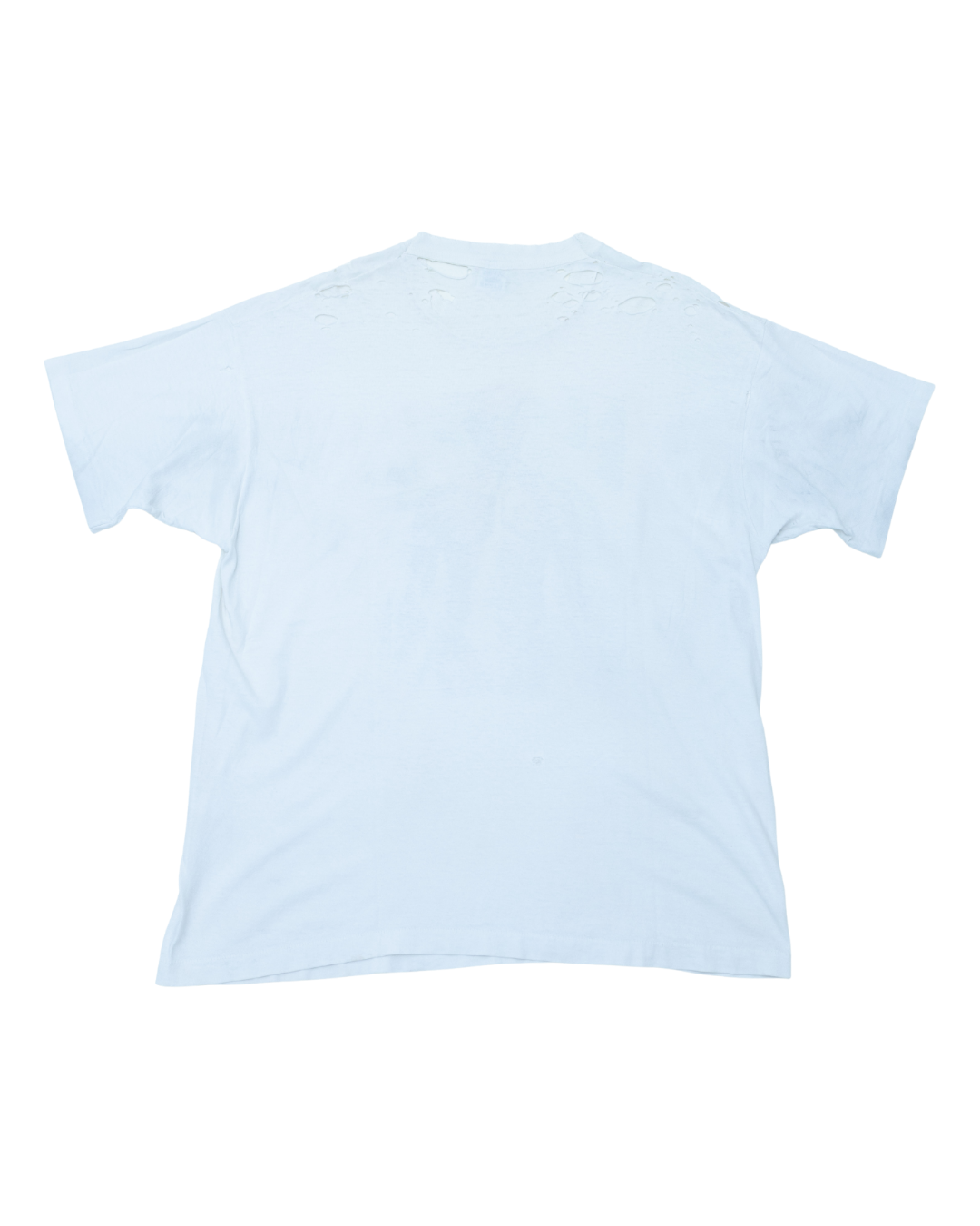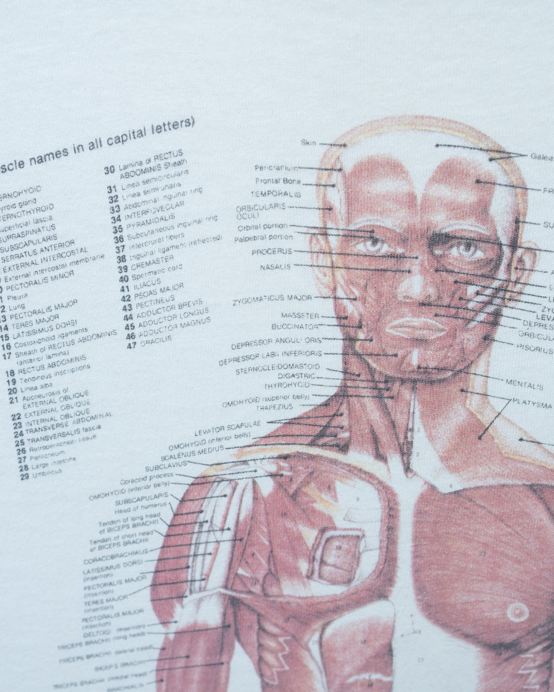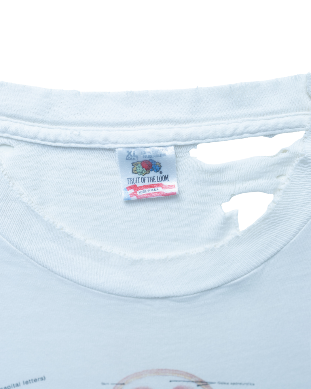 This 1990s anatomy tee echoes the one Kurt Cobain was famously photographed wearing, adding a layer of lore that makes it more than just a shirt — it’s a wall-worthy artifact. Known for his fascination with science and offbeat graphics, Cobain turned tees like this into an extension of Nirvana’s anti-fashion ethos. The heavy wear, fraying at the collar, and “neck stabs” give it the kind of authentic distressing collectors prize. Pair it with Nevermind’s “Smells Like Teen Spirit” or “Lithium,” or dig deeper into In Utero with “Heart-Shaped Box” to feel the era this shirt represents.